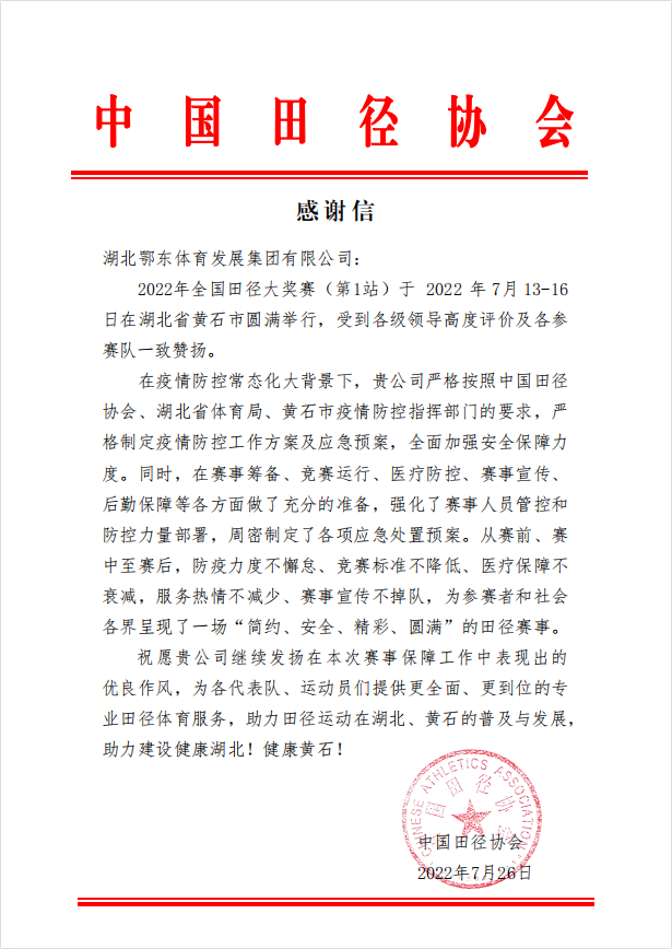 近日,中国田径协会发来感谢信,信中对鄂东体育集团的保障工作给予了高度肯定,为集团出色的赛事组织、细致的工作态度、精益求精的工作作风等方面点赞。