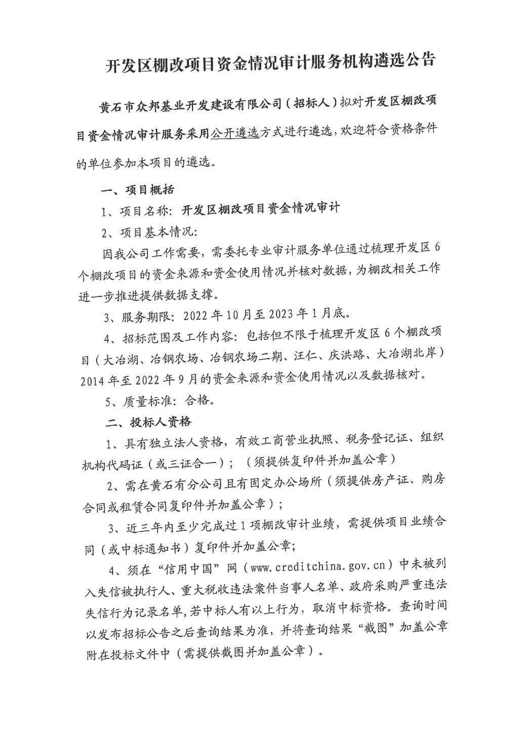 黄石市众邦基业开发建设有限公司(招标人)拟对开发区棚改项目资金情况审计服务采用公开遴选方式进行遴选,欢迎符合资格条件的单位参加本项目的遴选。