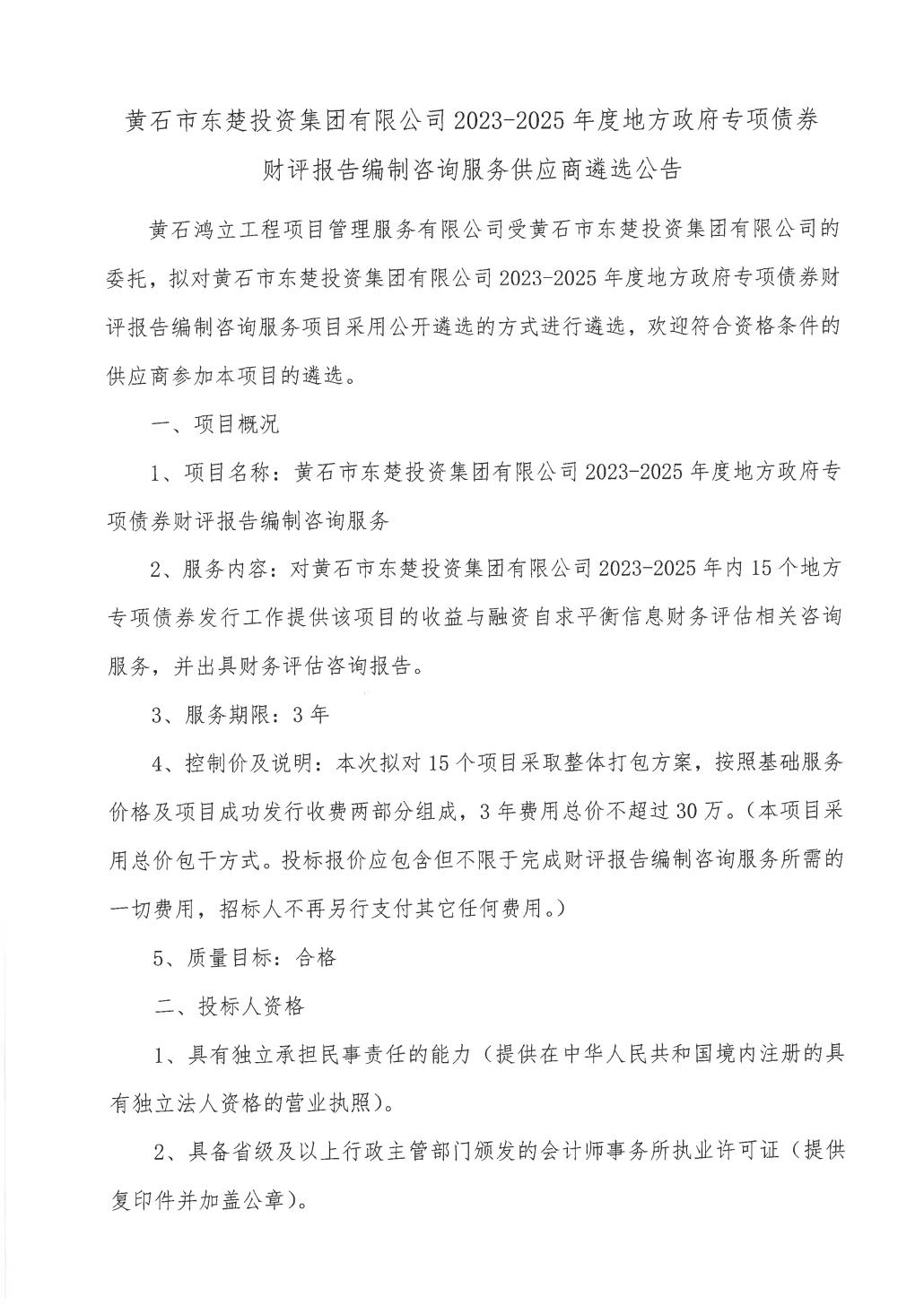 黄石市东楚投资集团有限公司2023-2025年度地方政府专项债券财评报告编制咨询服务供应商遴选公告