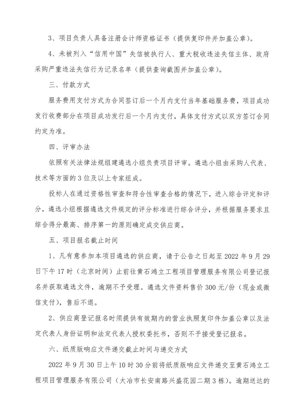 黄石鸿立工程项目管理服务有限公司受黄石市东楚投资集团有限公司的委托,拟对黄石市东楚投资集团有限公司2023-2025年度地方政府专项债券财评报告编制咨询服务项目采用公开遴选的方式进行遴选,欢迎符合资格条件的供应商参加本项目的遴选。