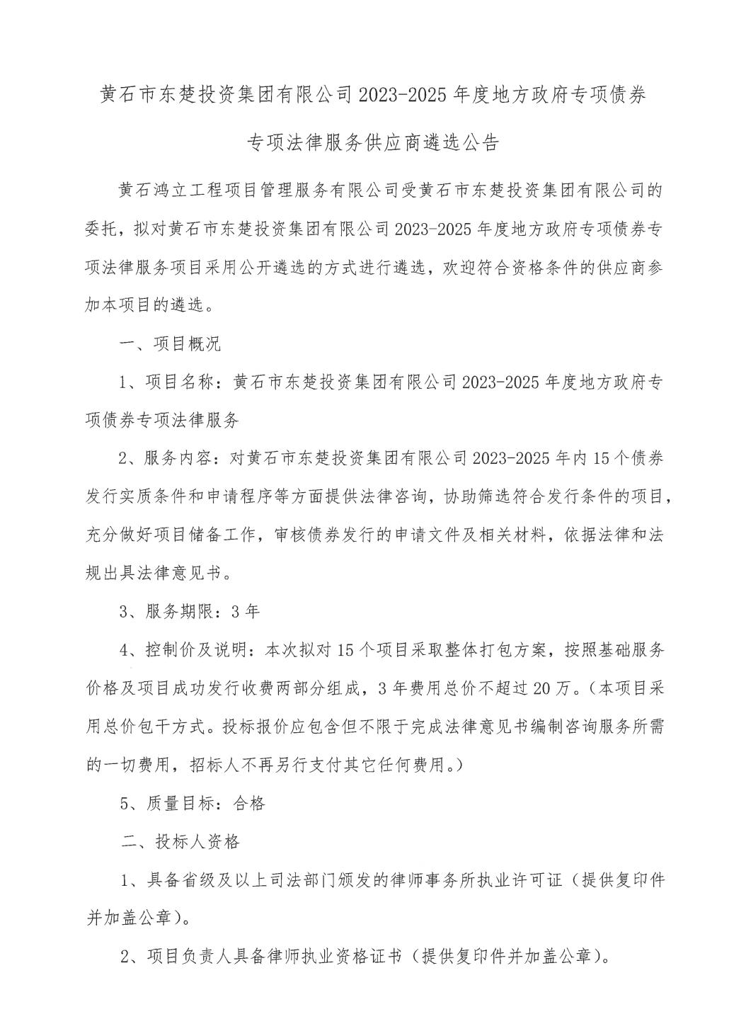 黄石市东楚投资集团有限公司2023-2025年度地方政府专项债券专项法律服务供应商遴选公告