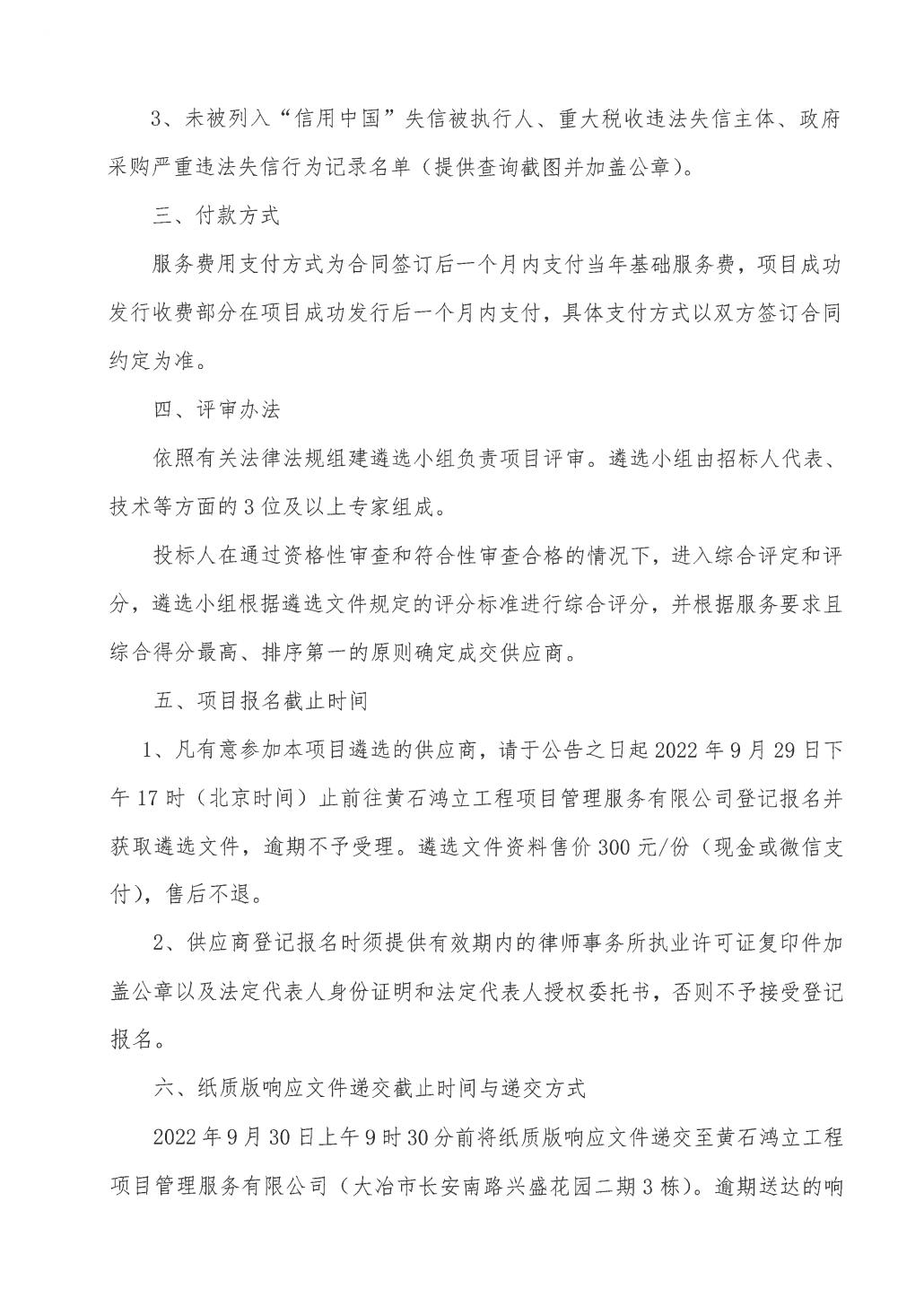 黄石鸿立工程项目管理服务有限公司受黄石市东楚投资集团有限公司的委托,拟对黄石市东楚投资集团有限公司2023-2025年度地方政府专项债券专项法律服务项目采用公开遴选的方式进行遴选,欢迎符合资格条件的供应商参加本项目的遴选。