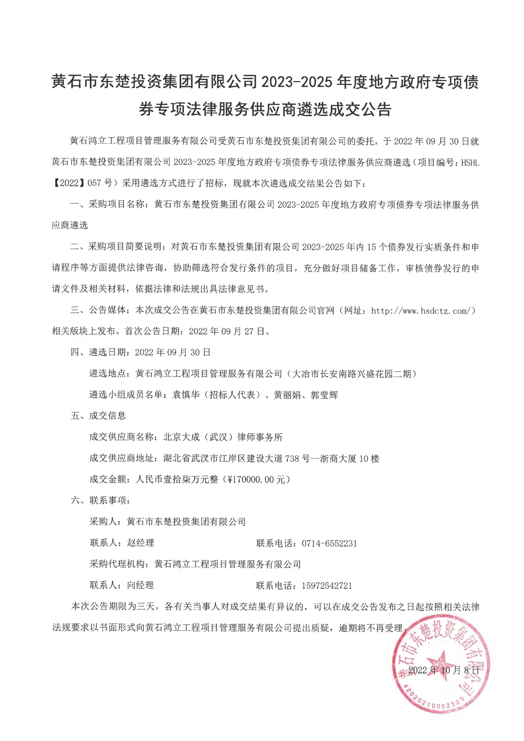 黄石鸿立工程项目管理服务有限公司受黄石市东楚投资集团有限公司的委托,于2022年09月30日就黄石市东楚投资集团有限公司2023-2025年度地方政府专项债券专项法律服务供应商遴选(项目编号:HSHL【2022】057号)采用遴选方式进行了招标,现就本次遴选成交结果公告如下。