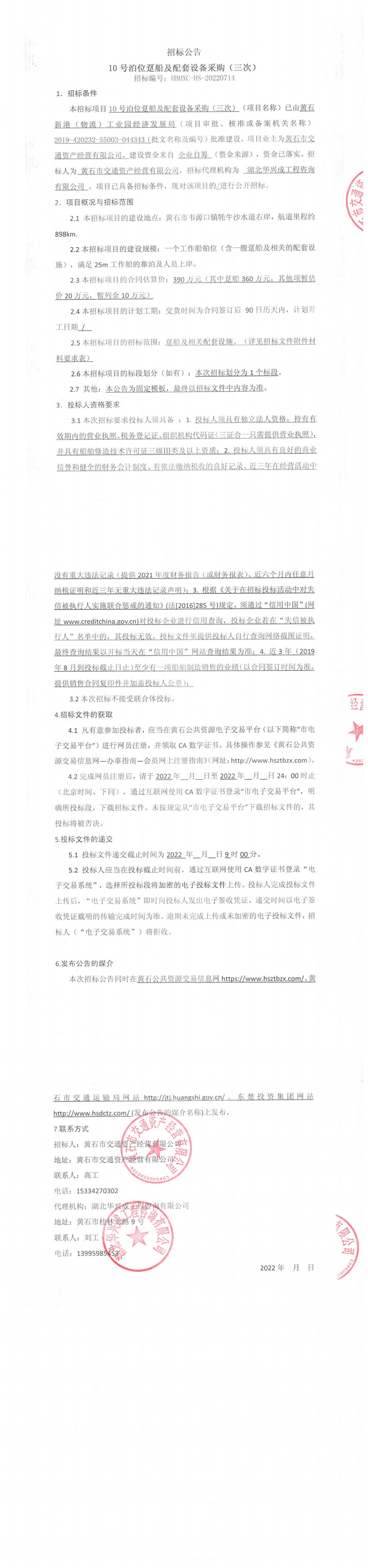 10号泊位趸船及配套设备采购(三次)招标公告