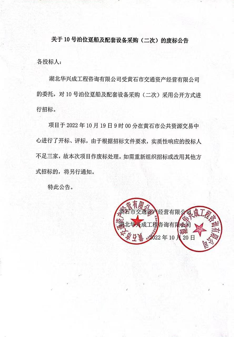 关于10号泊位趸船及配套设备采购(二次)的废标公告