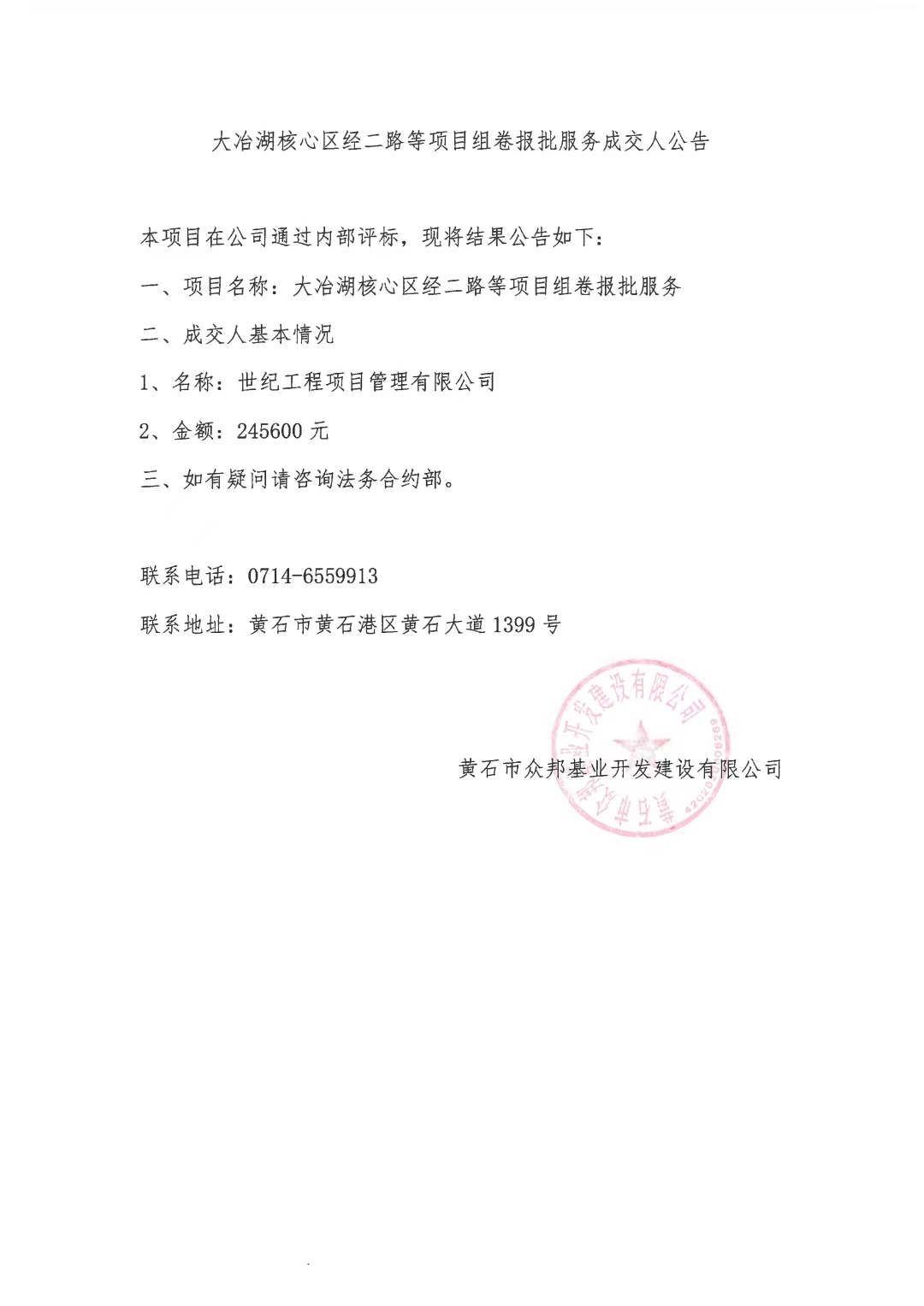 大冶湖核心区经二路等项目组卷报批服务成交人公告