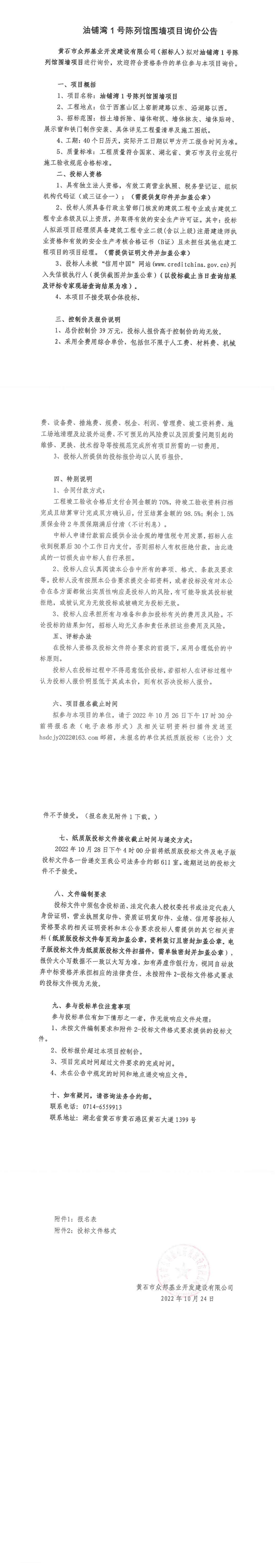 黄石市众邦基业开发建设有限公司(招标人)拟对油铺湾1号陈列馆围墙项目进行询价,欢迎符合资格条件的单位参与本项目询价。