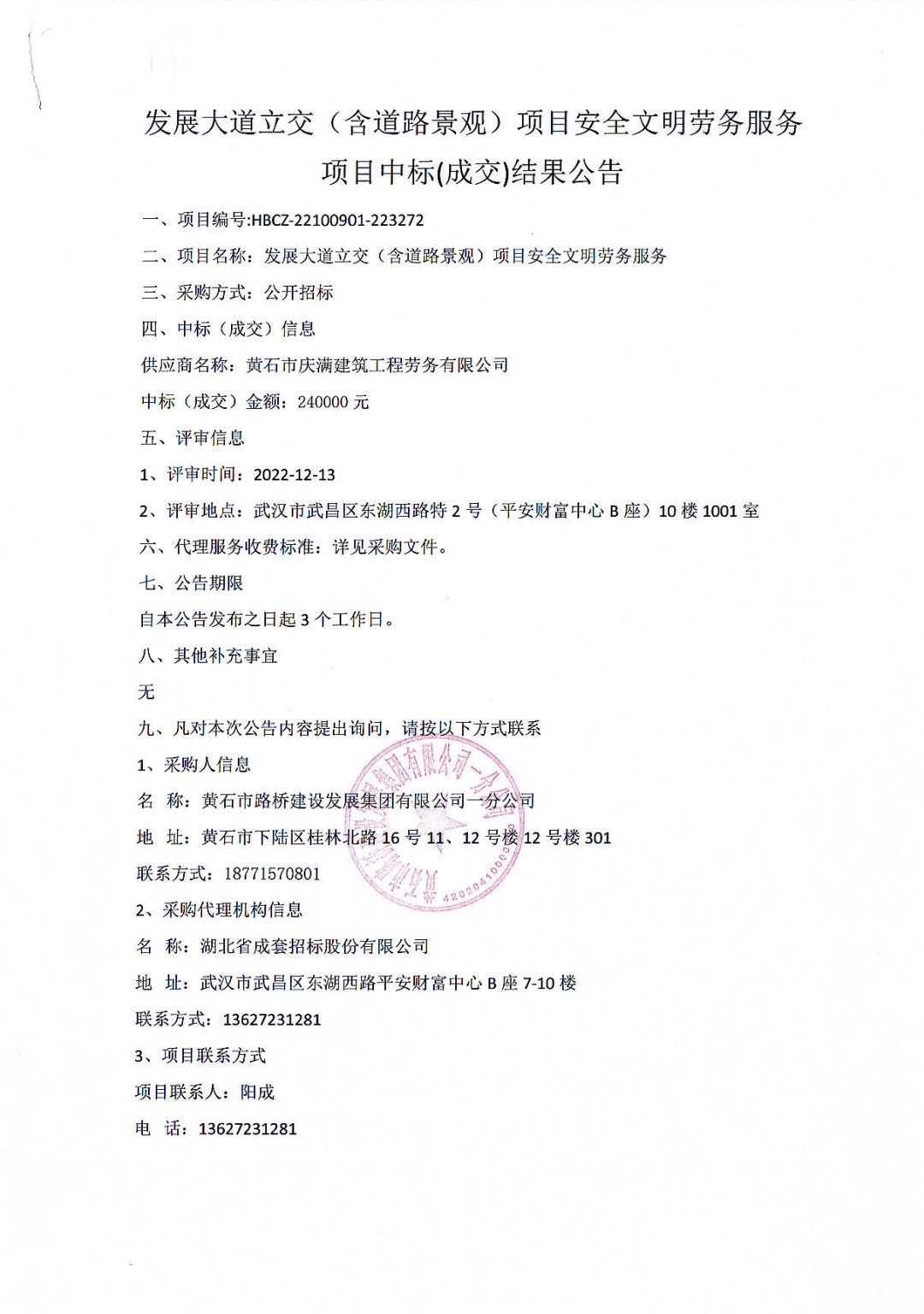 发展大道立交(含道路景观)项目安全文明劳务服务项目中标(成交)结果公告